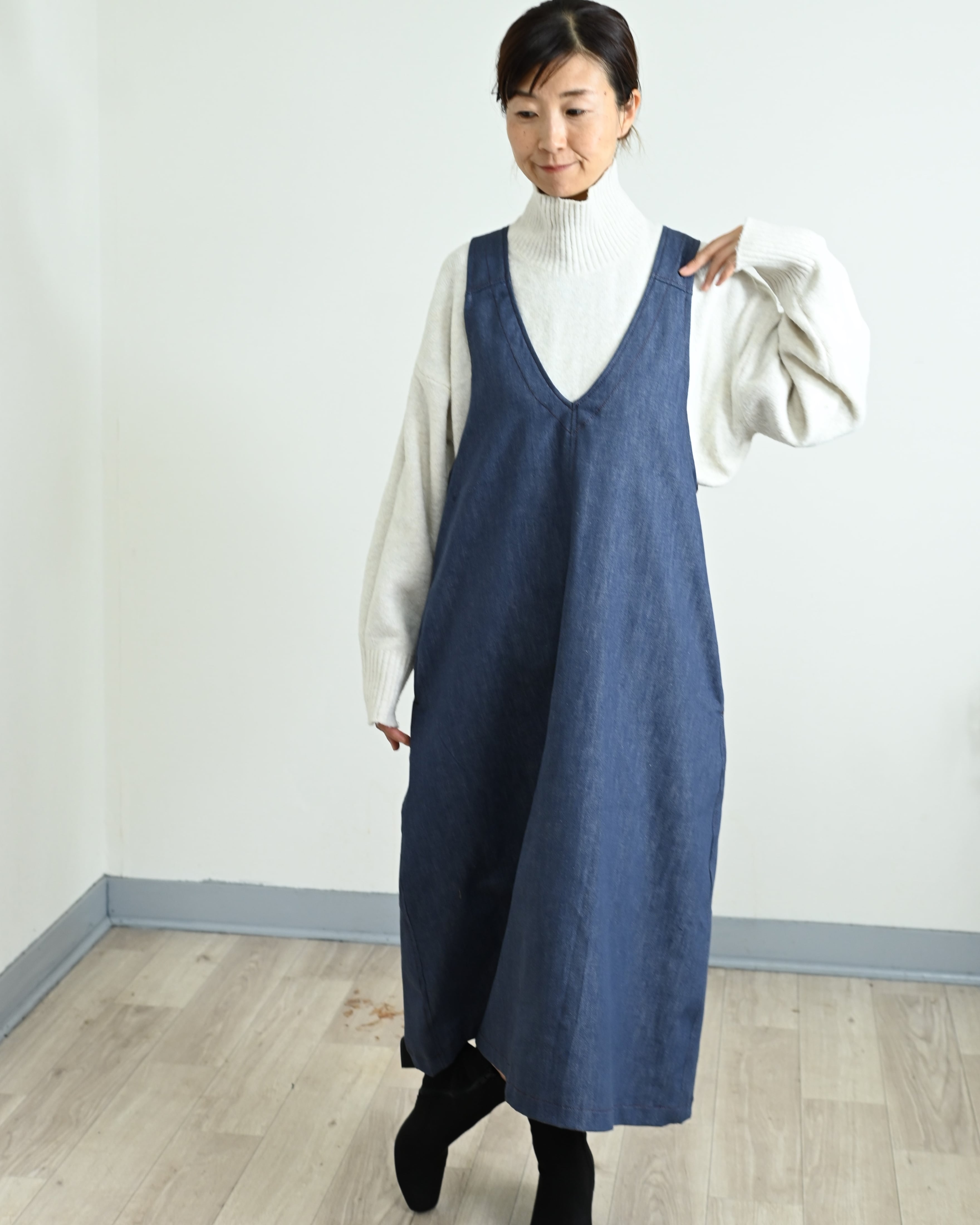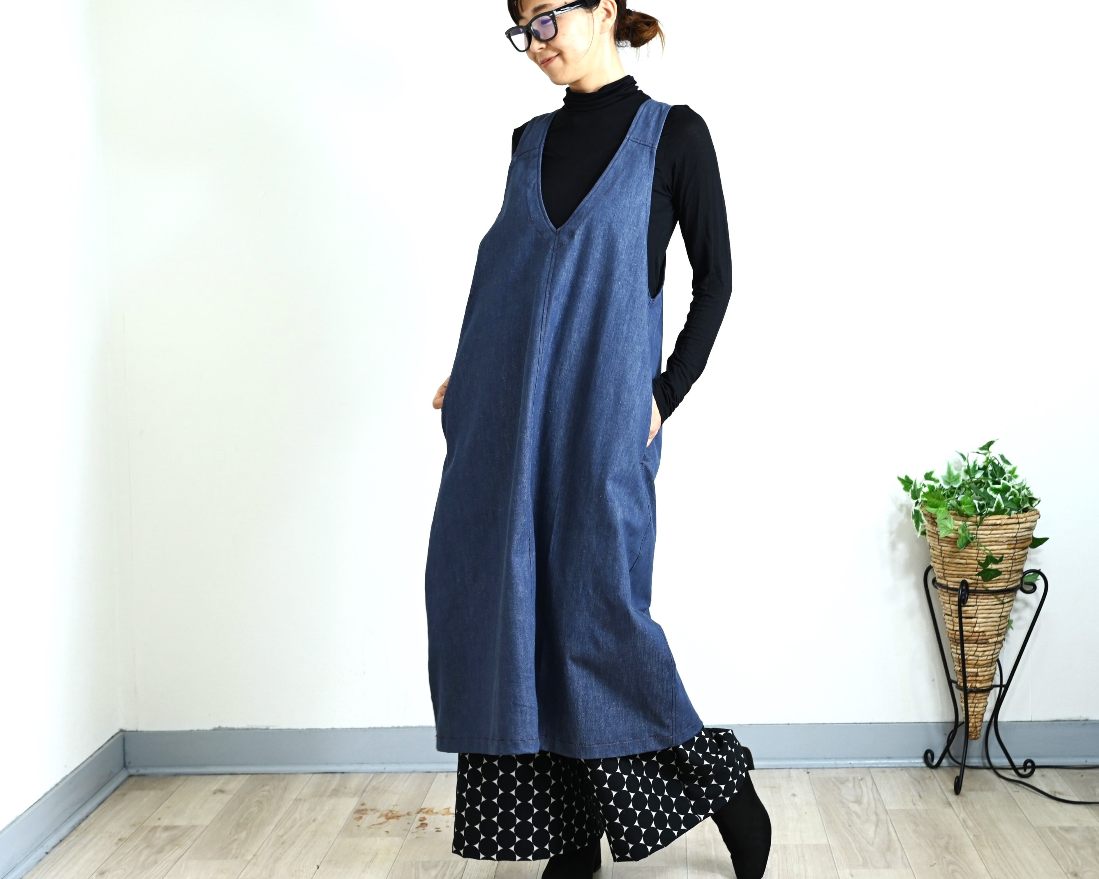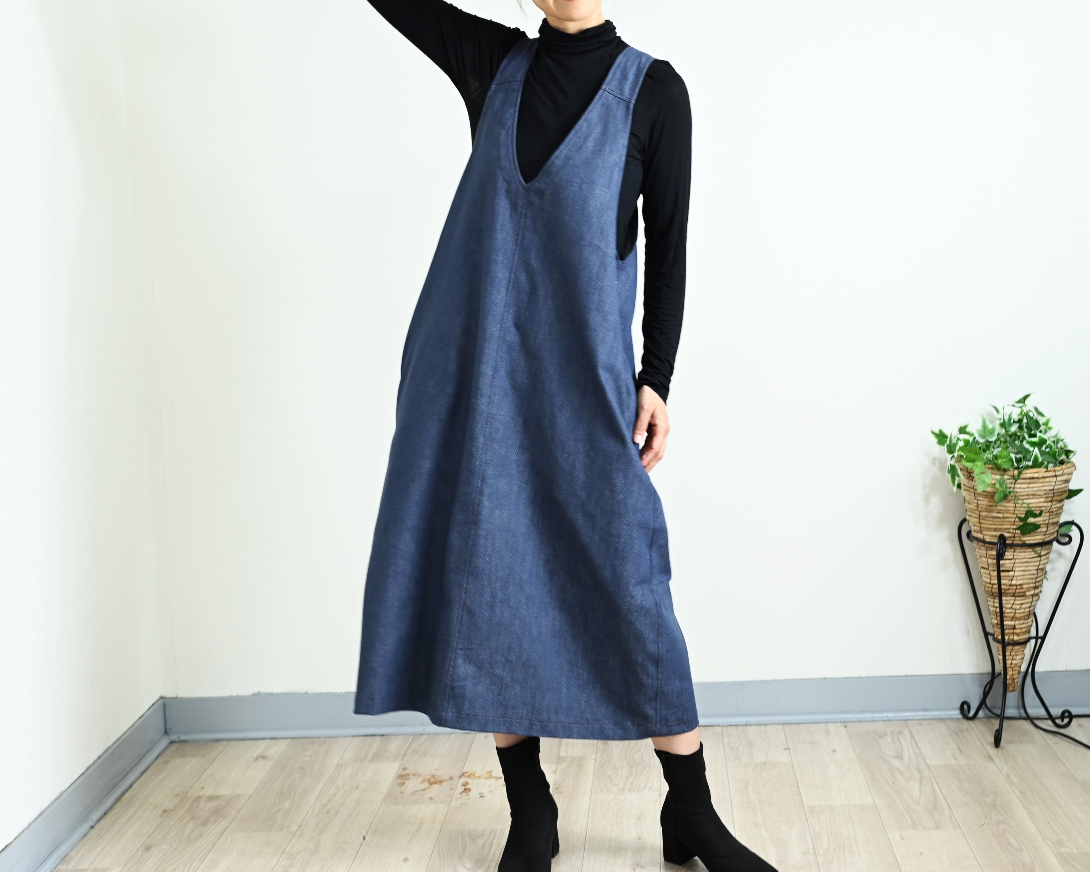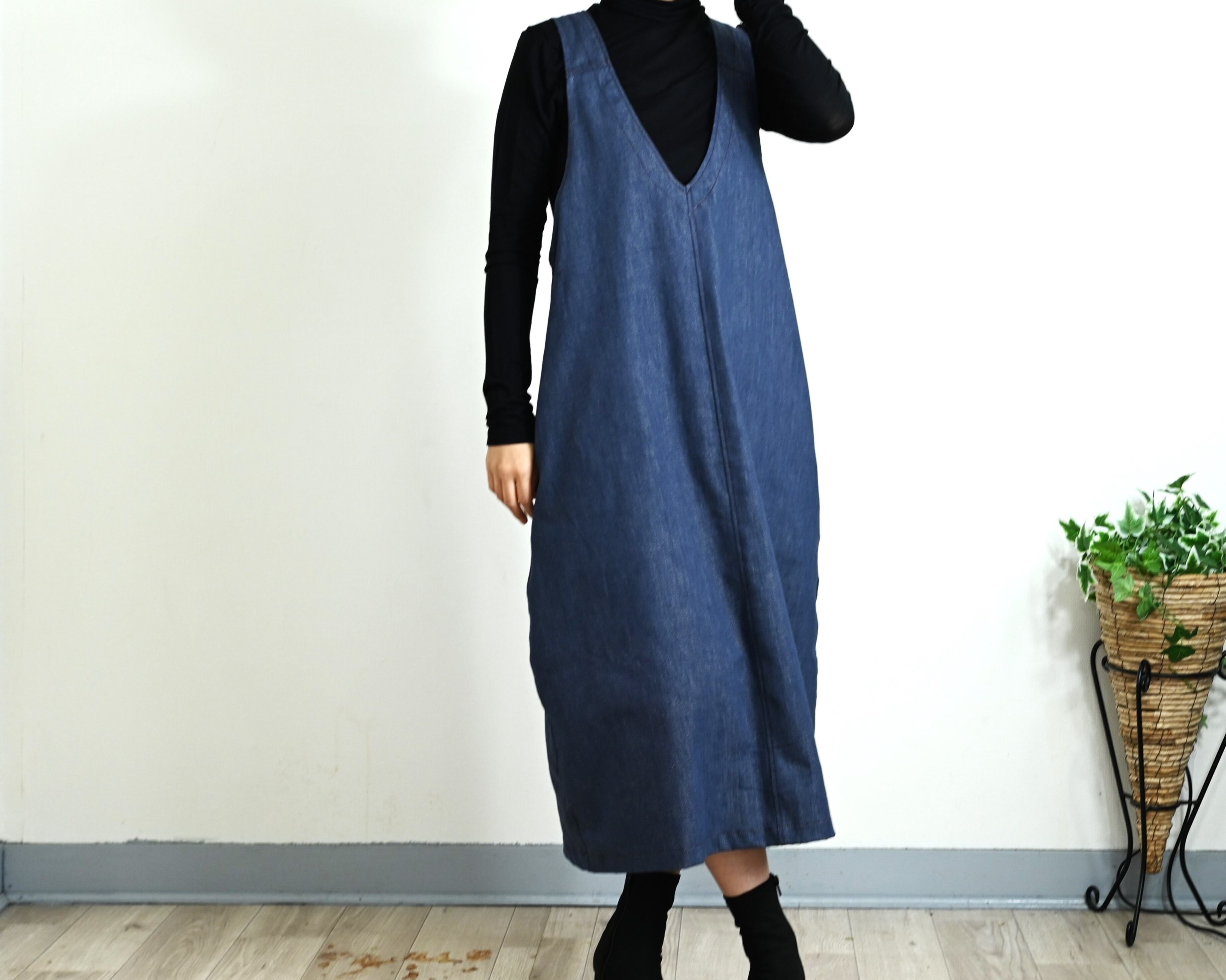 深V開きのデニムジャンパースカート:軽くてしなやかな8オンスデニム