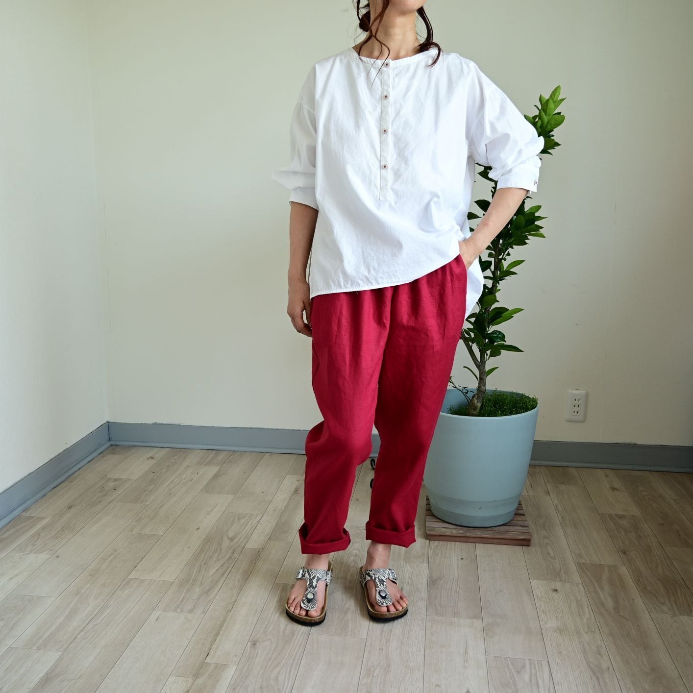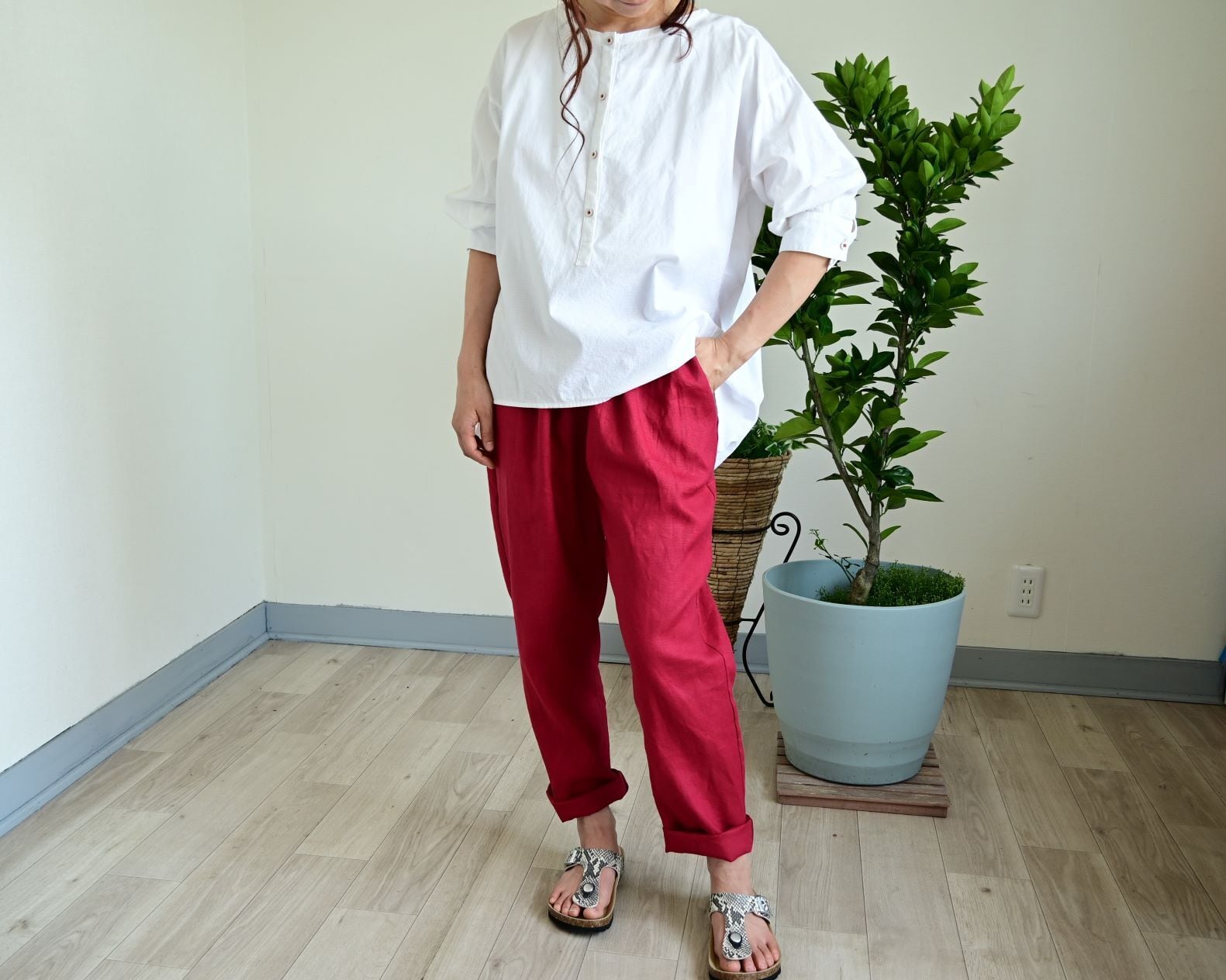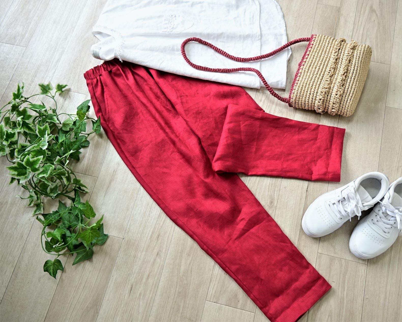 無難にまとまるお色のパンツはワードローブに結構あるけど今日のお出掛けコーディには何となくもの足りない、、、と感じたら⚡すこし攻めた鮮やかレッドのリネンパンツは如何でしょか♪